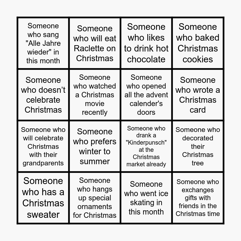 This bingo card has 16 words: Someone who hangs up special ornaments for Christmas, Someone who decorated their Christmas tree, Someone who likes to drink hot chocolate, Someone who sang "Alle Jahre wieder" in this month, Someone who will celebrate Christmas with their grandparents, Someone who will eat Raclette on Christmas, Someone who drank a "Kinderpunsch" at the Christmas market already, Someone who went ice skating in this month, Someone who doesn’t celebrate Christmas, Someone who watched a Christmas movie recently, Someone who has a Christmas sweater, Someone who baked Christmas cookies, Someone who prefers winter to summer, Someone who wrote a Christmas card, Someone who opened all the advent calender's doors and Someone who exchanges gifts with friends in the Christmas time.