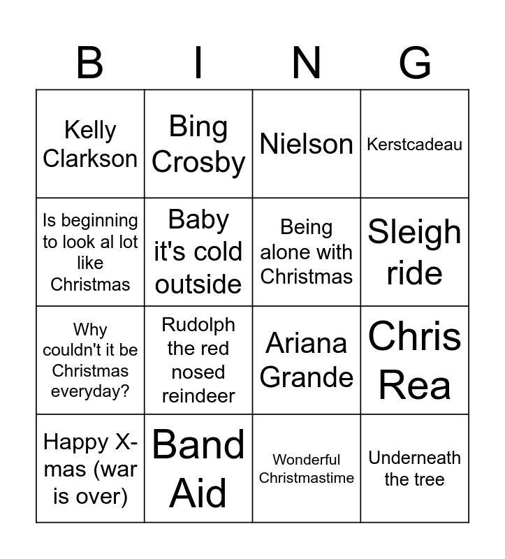 This bingo card has 91 words: Free!, Last Christmas, Wham!, All I want fot Christmas is You, Mariah Carey, Snowman, Sia, Flappie, Youp van 't Hek, Niets is cooler dan kerstmis, Kinderen voor kinderen, It's the most wonderful time of the year, Andy Williams, Wonderful Christmastime, Paul McCartney, Sleigh ride, The Ronettes, Merry Christmas Everyone, Shakin’ Stevens, It's gonna be a cold cold Christmas, Dana, Please come home for Christmas, Eagles, Santa tell me, Ariana Grande, Feliz Navidad, José Feliciano, Let it snow!, Michael Bublé, Christmas lights, Coldplay, Jingle Bell rock, Darrel Hall & John Oates, Underneath the tree, Kelly Clarkson, Kerstcadeau, Nielson, Driving home for Christmas, Chris Rea, Rudolph the red nosed reindeer, John Denver, Baby it's cold outside, Glee cast & Darren Criss, Carol of the bells, Cathedral choir, Coming home with Santa, OG3NE, We all stand together, Paul McCartney, Shake up Christmas, Train, Why couldn't it be Christmas everyday?, Bianca Ryan, What Christmas means to me, John Legend & Stevie Wonder, Do they know it's Christmas?, Band Aid, Merry X-mas everybody, Robbie Williams, My only wish (this year), Britney Spears, I wish you a merry Christmas, Bing Crosby, Santa Claus is comin’ to town, Bruce Spingsteen, Rockin’ around the Christmas tree, Brenda Lee, Winter wonderland, Tony Bennett, White Christmas, Bing Crosby, Happy X-mas (war is over), John Lennon & Yoko Ono, Silent night, Bing Crosby, Being alone with Christmas, Miss Montreal, Hallelujah, Lisa Loïs, Have a holly jolly Christmas, Johnny Mathis, Is beginning to look al lot like Christmas, Perry Como, Jingle bells, Christmas Party Stars, Thank God it's Christmas, Queen, Santa baby, Kyllie Minogue, Lonely this Christmas- Mud and Here comes Santa Claus - Gene Autry.