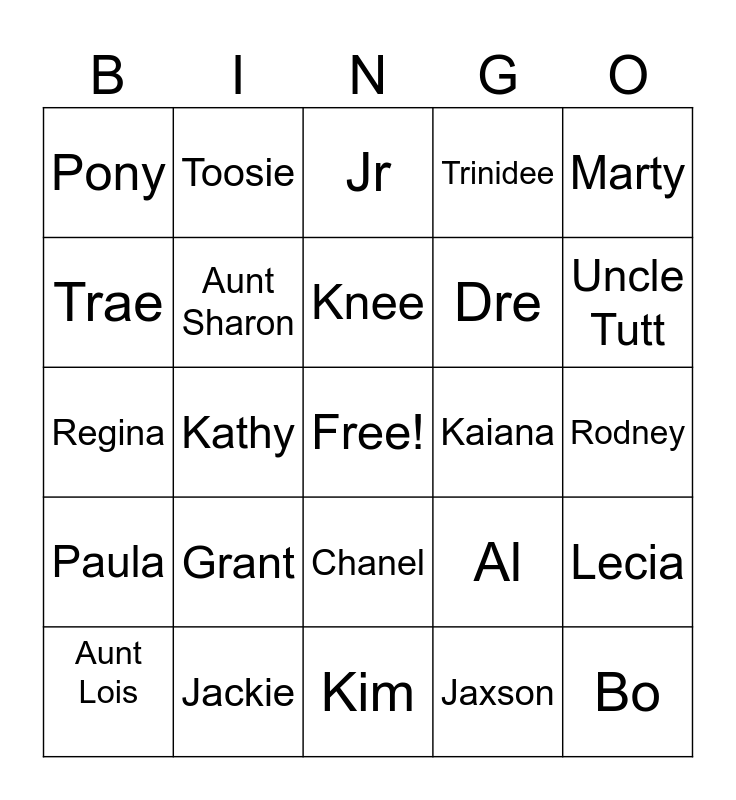 This bingo card has a free space and 39 words: Shon, Aunt Bertha, Catrina, Aunt Sharon, Aunt Lois, Chanel, Knee, Aunt Ree, Marty, Paula, Kathy, Trinidee, Bo, Rodney, Kaiana, Grant, Laiyla, Pony, Co, Al, Trae, Kim, Dre, Uncle Tutt, Faith, Aunt Ruby, Uncle Doug, Trisha, Cilla, Toosie, Deon, Angela, Jr, Jackie, Jaxson, Josh, Lecia, Regina and Dorian.