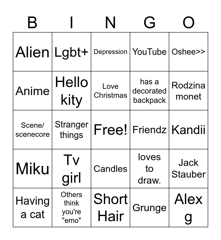 This bingo card has a free space and 24 words: Tv girl, Others think you're "emo", Love Christmas, Having a cat, Oshee>>, Alien, Anime, Lgbt+, Friendz, Candles, has a decorated backpack, Scene/ scenecore, loves to draw., Jack Stauber, Hello kity, Grunge, Kandii, Depression, Rodzina monet, Stranger things, Alex g, Miku, YouTube and Short Hair.