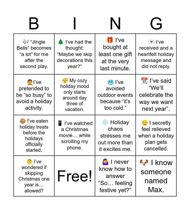 This bingo card has 16 words: Free!, 😌 I secretly feel relieved when a holiday plan gets cancelled., 🎁 I’ve bought at least one gift at the very last minute., 🎶 “Jingle Bells” becomes “a lot” for me after the second play., 🍪 I’ve eaten holiday treats before the holidays officially started., 🌲 I’ve had the thought: “Maybe we skip decorations this year?”, ❄️ Holiday chaos stresses me out more than it excites me., 🤷♀️ I never know how to answer “So… feeling festive yet?”, 🙅I’ve pretended to be “so busy” to avoid a holiday activity., 😴 My cozy holiday mood only starts around day three of vacation., 🤔 I’ve wondered if skipping Christmas one year is… allowed?, 💌 I’ve received and a heartfelt holiday message and did not reply., 📱 I’ve watched a Christmas movie… while scrolling my phone., 📆 I’ve said “We’ll celebrate the way we want next year”., 🥶 I’ve avoided outdoor events because “it’s too cold.” and 🐶 I know someone named Max..