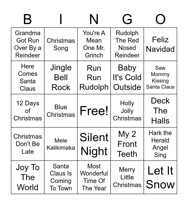 This bingo card has a free space and 30 words: Santa Claus Is Coming To Town, Rockin Around The Christmas Tree, Blue Christmas, White Christmas, Grandma Got Run Over By a Reindeer, You're A Mean One Mr. Grinch, Jingle Bell Rock, Silent Night, Holly Jolly Christmas, Most Wonderful Time Of The Year, Deck The Halls, Let It Snow, Merry Little Christmas, Frosty The Snowman, Saw Mommy Kissing Santa Claus, Hippo For Christmas, My 2 Front Teeth, Christmas Don't Be Late, Mele Kalikimaka, Feliz Navidad, 12 Days of Christmas, Look Like Christmas, Christmas Song, Baby It's Cold Outside, Here Comes Santa Claus, Rudolph The Red Nosed Reindeer, Hark the Herald Angel Sing, Joy To The World, Run Run Rudolph and Sleigh Ride.