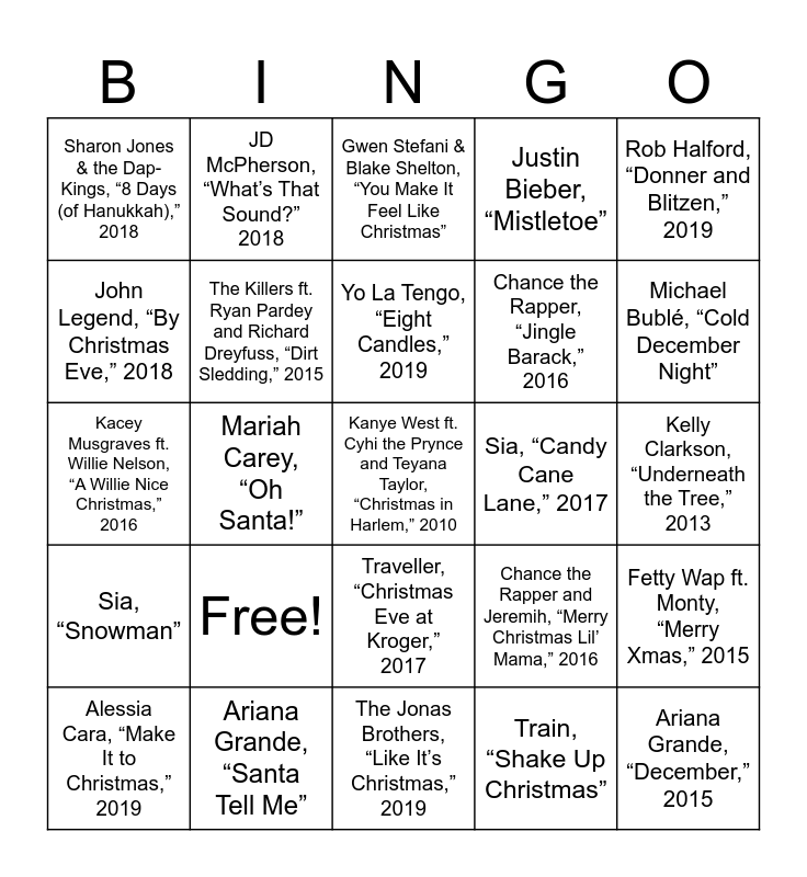 This bingo card has 25 words: Free!, The Jonas Brothers, “Like It’s Christmas,” 2019, Yo La Tengo, “Eight Candles,” 2019, Alessia Cara, “Make It to Christmas,” 2019, Rob Halford, “Donner and Blitzen,” 2019, Sharon Jones & the Dap-Kings, “8 Days (of Hanukkah),” 2018, John Legend, “By Christmas Eve,” 2018, JD McPherson, “What’s That Sound?” 2018, Sia, “Candy Cane Lane,” 2017, Traveller, “Christmas Eve at Kroger,” 2017, Chance the Rapper, “Jingle Barack,” 2016, Kacey Musgraves ft. Willie Nelson, “A Willie Nice Christmas,” 2016, Chance the Rapper and Jeremih, “Merry Christmas Lil’ Mama,” 2016, Fetty Wap ft. Monty, “Merry Xmas,” 2015, The Killers ft. Ryan Pardey and Richard Dreyfuss, “Dirt Sledding,” 2015, Ariana Grande, “December,” 2015, Kelly Clarkson, “Underneath the Tree,” 2013, Gwen Stefani & Blake Shelton, “You Make It Feel Like Christmas”, Michael Bublé, “Cold December Night”, Mariah Carey, “Oh Santa!”, Kanye West ft. Cyhi the Prynce and Teyana Taylor, “Christmas in Harlem,” 2010, Ariana Grande, “Santa Tell Me”, Sia, “Snowman”, Justin Bieber, “Mistletoe” and Train, “Shake Up Christmas”.