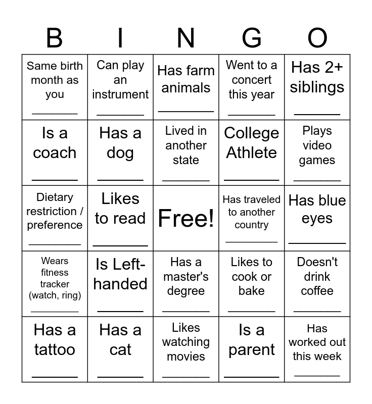 This bingo card has a free space and 24 words: Is Left-handed _____, Has a cat _____, Lived in another state _______, Has a tattoo _____, Has 2+ siblings _____, Same birth month as you _______, Is a coach _____, Can play an instrument _______, Has traveled to another country _________, Has a master's degree _______, College Athlete ______, Dietary restriction / preference ________, Likes to cook or bake _______, Doesn't drink coffee _______, Has a dog _____, Is a parent ______, Has blue eyes _______, Has farm animals _______, Plays video games _______, Likes to read ______, Has worked out this week _______, Wears fitness tracker (watch, ring) _________, Went to a concert this year _______ and Likes watching movies _______.