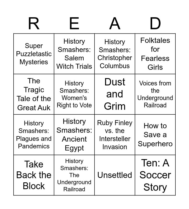 This bingo card has 22 words: History Smashers: The Underground Railroad, Nightingale, History Smashers: Salem Witch Trials, 365 Days to Alaska, History Smashers: Women's Right to Vote, Dust and Grim, Super Puzzletastic Mysteries, History Smashers: Christopher Columbus, Ruby Finley vs. the Intersteller Invasion, Ten: A Soccer Story, History Smashers: Plagues and Pandemics, Folktales for Fearless Girls, The Kiya Girl, History Smashers: The American Revolution, Unsettled, History Smashers: Earth Day and the Enviornment, How to Save a Superhero, Take Back the Block, History Smashers: Ancient Egypt, The Tragic Tale of the Great Auk, Voices from the Underground Railroad and Feathered Serpent and the Five Suns.