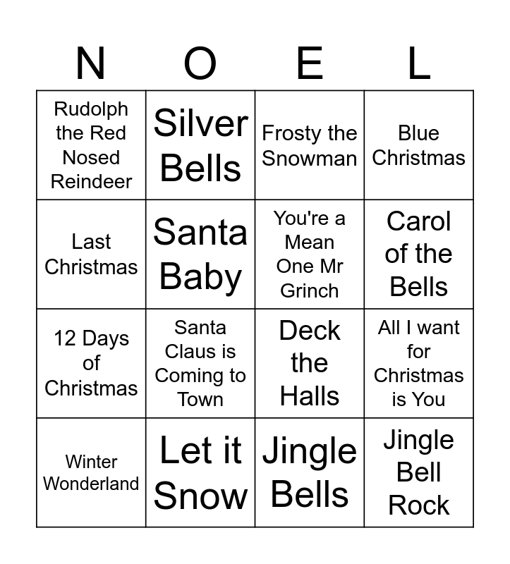 This bingo card has 16 words: Let it Snow, All I want for Christmas is You, Frosty the Snowman, Rudolph the Red Nosed Reindeer, 12 Days of Christmas, Silver Bells, Deck the Halls, Jingle Bells, Last Christmas, Santa Baby, Winter Wonderland, Blue Christmas, Santa Claus is Coming to Town, Carol of the Bells, You're a Mean One Mr Grinch and Jingle Bell Rock.