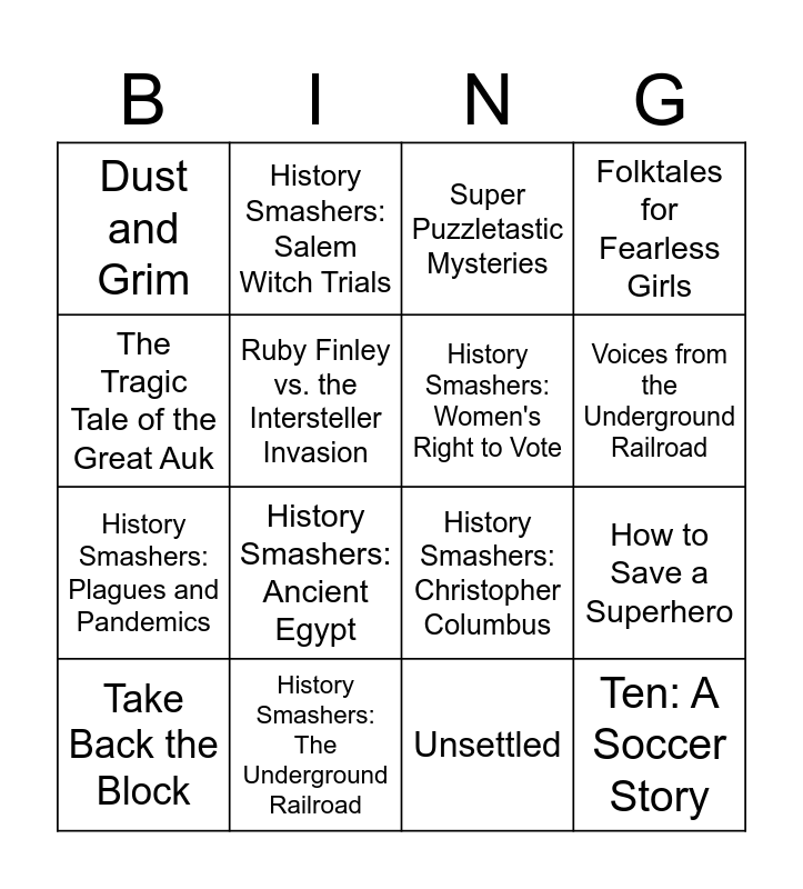 This bingo card has 22 words: History Smashers: The Underground Railroad, Nightingale, History Smashers: Salem Witch Trials, 365 Days to Alaska, Ruby Finley vs. the Intersteller Invasion, History Smashers: Women's Right to Vote, Dust and Grim, Super Puzzletastic Mysteries, History Smashers: Christopher Columbus, Ten: A Soccer Story, History Smashers: Plagues and Pandemics, Folktales for Fearless Girls, The Kiya Girl, History Smashers: The American Revolution, Unsettled, History Smashers: Earth Day and the Enviornment, How to Save a Superhero, Take Back the Block, History Smashers: Ancient Egypt, The Tragic Tale of the Great Auk, Voices from the Underground Railroad and Feathered Serpent and the Five Suns.