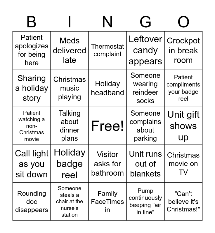 This bingo card has a free space and 37 words: Merry Christmas!, Christmas PJs, Holiday scrubs, Christmas music playing, Christmas movie on TV, Holiday badge reel, Holiday headband, Someone brings cookies, Crockpot in break room, Someone’s 3rd coffee, Talking about dinner plans, Leftover candy appears, "Can’t believe it’s Christmas!", Unit gift shows up, Sharing a holiday story, Call light as you sit down, "Help me real quick?", Thermostat complaint, Visitor asks for bathroom, Someone complains about parking, Patient apologizes for being here, Patient compliments your badge reel, Rounding doc disappears, Family FaceTimes in, "It’s quiet today…", Pump continuously beeping "air in line", Meds delivered late, Lab calls: "Blood sample hemolyzed", Supply room missing what you need, Short-staffed mentioned, Patient asks for water again, Someone steals a chair at the nurse’s station, Patient watching a non-Christmas movie, Someone's pen disappears, Unit runs out of blankets, Someone wearing reindeer socks and Coffee spill at the nurses’ station.