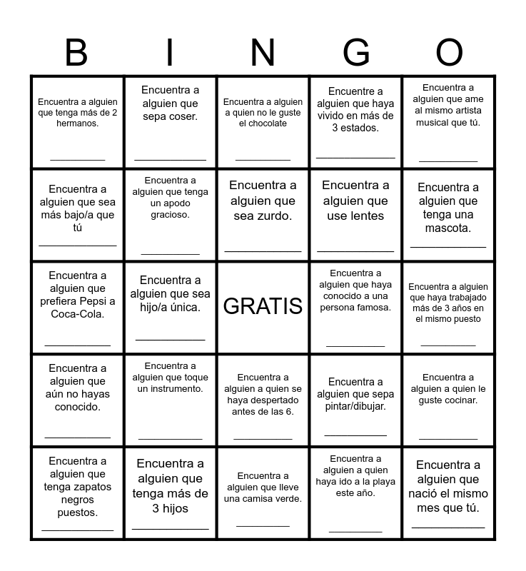 This bingo card has a free space and 25 words: Encuentra a alguien que tenga zapatos negros puestos. ____________, Encuentra a alguien que toque un instrumento. ____________, Encuentra a alguien que sea zurdo. ___________, Encuentra a alguien a quien haya ido a la playa este año. __________, Encuentra a alguien que tenga una mascota. ____________, Encuentra a alguien que tenga más de 2 hermanos. ___________, Encuentra a alguien que sepa coser. ____________, Encuentra a alguien a quien no le guste el chocolate ___________, Encuentra a alguien que use lentes ___________, Encuentra a alguien a quien le guste cocinar. ___________, Encuentra a alguien que prefiera Pepsi a Coca-Cola. ___________, Encuentra a alguien que tenga un apodo gracioso. ___________, Encuentra a alguien que sepa pintar/dibujar. ___________, Encuentra a alguien que nació el mismo mes que tú. ___________, Encuentra a alguien que sea más bajo/a que tú _____________, Encuentra a alguien que tenga más de 3 hijos ___________, Encuentra a alguien que lleve una camisa verde. __________, Encuentre a alguien que haya vivido en más de 3 estados. ______________, Encuentra a alguien que haya trabajado más de 3 años en el mismo puesto ___________, Encuentra a alguien que aún no hayas conocido. ___________, Encuentra a alguien que sea hijo/a única. ___________, Encuentra a alguien a quien se haya despertado antes de las 6. ___________, Encuentra a alguien que haya conocido a una persona famosa. ___________, Encuentra a alguien que ame al mismo artista musical que tú. ___________ and Find someone who is wearing a blue shirt. ____________.