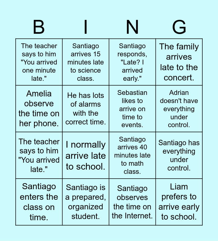 This bingo card has 16 words: Santiago is a prepared, organized student., Santiago has everything under control., Santiago responds, "Late? I arrived early.", The teacher says to him "You arrived one minute late.", The teacher says to him "You arrived late.", Santiago arrives 15 minutes late to science class., Santiago arrives 40 minutes late to math class., Santiago observes the time on the Internet., Amelia observe the time on her phone., He has lots of alarms with the correct time., Santiago enters the class on time., The family arrives late to the concert., I normally arrive late to school., Adrian doesn't have everything under control., Sebastian likes to arrive on time to events. and Liam prefers to arrive early to school..