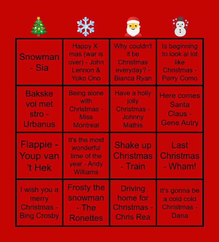 This bingo card has 49 words: My only wish (this year) - Britney Spears, I wish you a merry Christmas - Bing Crosby, Santa Claus is comin’ to town - Bruce Spingsteen, Rockin’ around the Christmas tree - Brenda Lee, Winter wonderland - Tony Bennett, White Christmas - Bing Crosby, Happy X-mas (war is over) - John Lennon & Yoko Ono, Silent night - Bing Crosby, Being alone with Christmas - Miss Montreal, Hallelujah - Lisa Loïs, Have a holly jolly Christmas - Johnny Mathis, Is beginning to look al lot like Christmas - Perry Como, Jingle bells - Christmas Party Stars, Thank God it's Christmas - Queen, Santa baby - Kyllie Minogue, Lonely this Christmas- Mud, Here comes Santa Claus - Gene Autry, Frosty the snowman - The Ronettes, Ik ben een kerstbal - Bert en Ernie, Bakske vol met stro - Urbanus, Last Christmas - Wham!, All I want fot Christmas is You - Mariah Carey, Snowman - Sia, Flappie - Youp van 't Hek, Niets is cooler dan kerstmis - Kinderen voor kinderen, It's the most wonderful time of the year - Andy Williams, Wonderful Christmastime - Paul McCartney, Sleigh ride - The Ronettes, Merry Christmas Everyone - Shakin’ Stevens, It's gonna be a cold cold Christmas - Dana, Please come home for Christmas - Eagles, Santa tell me - Ariana Grande, Feliz Navidad - José Feliciano, Let it snow! - Michael Bublé, Christmas lights - Coldplay, Jingle Bell rock - Darrel Hall & John Oates, Underneath the tree - Kelly Clarkson, Kerstcadeau - Nielson, Driving home for Christmas - Chris Rea, Rudolph the red nosed reindeer - John Denver, Baby it's cold outside - Glee cast & Darren Criss, Carol of the bells - Cathedral choir, Coming home with Santa - OG3NE, We all stand together - Paul McCartney, Shake up Christmas - Train, Why couldn't it be Christmas everyday? - Bianca Ryan, What Christmas means to me - John Legend & Stevie Wonder, Do they know it's Christmas? - Band Aid and Merry X-mas everybody - Robbie Williams.