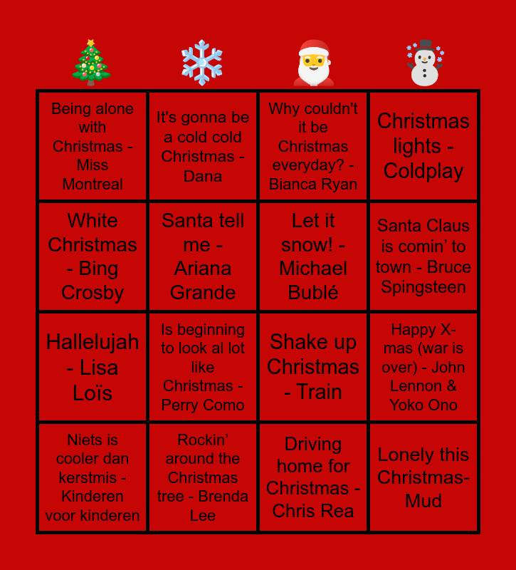 This bingo card has 49 words: Flappie - Youp van 't Hek, Niets is cooler dan kerstmis - Kinderen voor kinderen, It's the most wonderful time of the year - Andy Williams, Wonderful Christmastime - Paul McCartney, Sleigh ride - The Ronettes, Merry Christmas Everyone - Shakin’ Stevens, It's gonna be a cold cold Christmas - Dana, Please come home for Christmas - Eagles, Santa tell me - Ariana Grande, Feliz Navidad - José Feliciano, Let it snow! - Michael Bublé, Christmas lights - Coldplay, Jingle Bell rock - Darrel Hall & John Oates, Underneath the tree - Kelly Clarkson, My only wish (this year) - Britney Spears, I wish you a merry Christmas - Bing Crosby, Santa Claus is comin’ to town - Bruce Spingsteen, Rockin’ around the Christmas tree - Brenda Lee, Winter wonderland - Tony Bennett, White Christmas - Bing Crosby, Happy X-mas (war is over) - John Lennon & Yoko Ono, Silent night - Bing Crosby, Being alone with Christmas - Miss Montreal, Hallelujah - Lisa Loïs, Have a holly jolly Christmas - Johnny Mathis, Is beginning to look al lot like Christmas - Perry Como, Jingle bells - Christmas Party Stars, Thank God it's Christmas - Queen, Santa baby - Kyllie Minogue, Lonely this Christmas- Mud, Here comes Santa Claus - Gene Autry, Frosty the snowman - The Ronettes, Ik ben een kerstbal - Bert en Ernie, Bakske vol met stro - Urbanus, Last Christmas - Wham!, All I want fot Christmas is You - Mariah Carey, Snowman - Sia, Kerstcadeau - Nielson, Driving home for Christmas - Chris Rea, Rudolph the red nosed reindeer - John Denver, Baby it's cold outside - Glee cast & Darren Criss, Carol of the bells - Cathedral choir, Coming home with Santa - OG3NE, We all stand together - Paul McCartney, Shake up Christmas - Train, Why couldn't it be Christmas everyday? - Bianca Ryan, What Christmas means to me - John Legend & Stevie Wonder, Do they know it's Christmas? - Band Aid and Merry X-mas everybody - Robbie Williams.