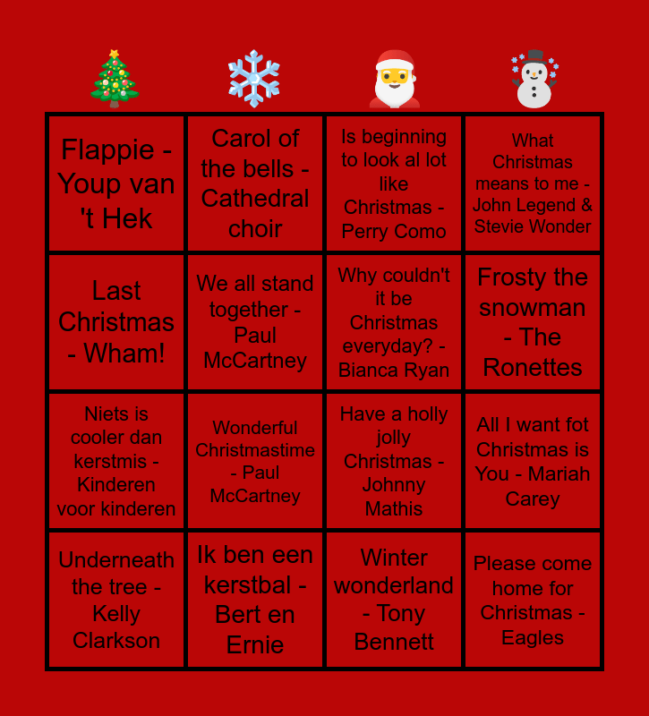 This bingo card has 49 words: Jingle Bell rock - Darrel Hall & John Oates, Underneath the tree - Kelly Clarkson, Kerstcadeau - Nielson, Driving home for Christmas - Chris Rea, Rudolph the red nosed reindeer - John Denver, Baby it's cold outside - Glee cast & Darren Criss, Carol of the bells - Cathedral choir, Coming home with Santa - OG3NE, We all stand together - Paul McCartney, Shake up Christmas - Train, Why couldn't it be Christmas everyday? - Bianca Ryan, What Christmas means to me - John Legend & Stevie Wonder, Do they know it's Christmas? - Band Aid, Merry X-mas everybody - Robbie Williams, Lonely this Christmas- Mud, Here comes Santa Claus - Gene Autry, Frosty the snowman - The Ronettes, Ik ben een kerstbal - Bert en Ernie, Bakske vol met stro - Urbanus, Last Christmas - Wham!, All I want fot Christmas is You - Mariah Carey, Snowman - Sia, Flappie - Youp van 't Hek, Niets is cooler dan kerstmis - Kinderen voor kinderen, It's the most wonderful time of the year - Andy Williams, Wonderful Christmastime - Paul McCartney, Sleigh ride - The Ronettes, Merry Christmas Everyone - Shakin’ Stevens, It's gonna be a cold cold Christmas - Dana, Please come home for Christmas - Eagles, Santa tell me - Ariana Grande, Feliz Navidad - José Feliciano, Let it snow! - Michael Bublé, Christmas lights - Coldplay, My only wish (this year) - Britney Spears, I wish you a merry Christmas - Bing Crosby, Santa Claus is comin’ to town - Bruce Spingsteen, Rockin’ around the Christmas tree - Brenda Lee, Winter wonderland - Tony Bennett, White Christmas - Bing Crosby, Happy X-mas (war is over) - John Lennon & Yoko Ono, Silent night - Bing Crosby, Being alone with Christmas - Miss Montreal, Hallelujah - Lisa Loïs, Have a holly jolly Christmas - Johnny Mathis, Is beginning to look al lot like Christmas - Perry Como, Jingle bells - Christmas Party Stars, Thank God it's Christmas - Queen and Santa baby - Kyllie Minogue.