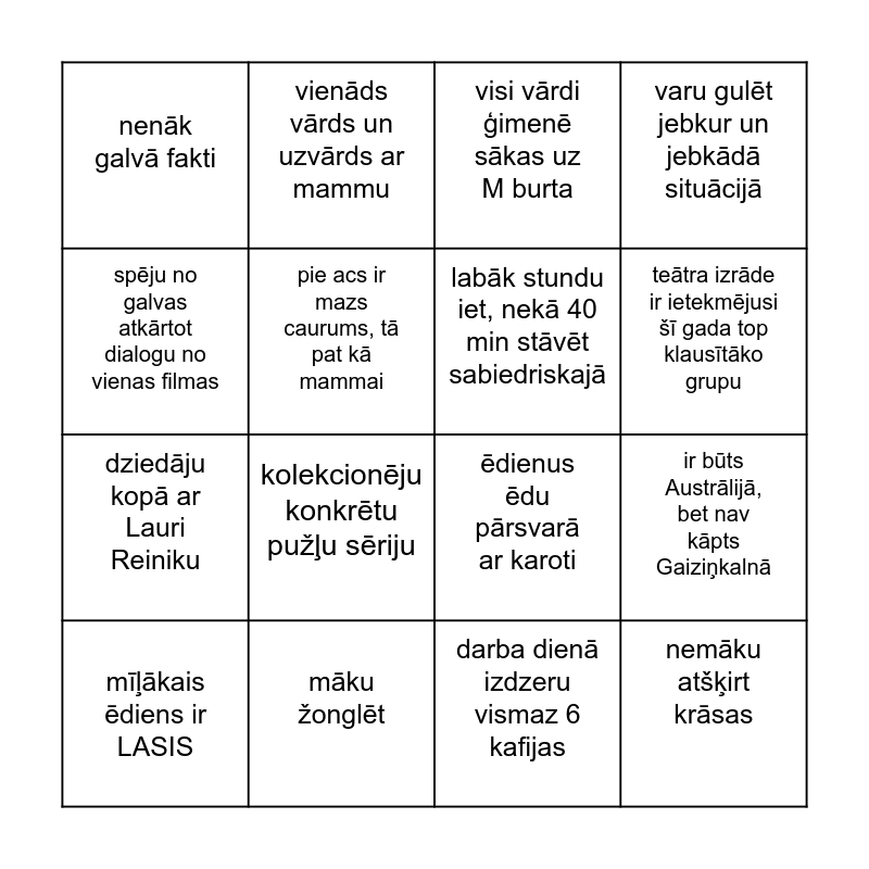 This bingo card has 16 words: māku žonglēt, ir būts Austrālijā, bet nav kāpts Gaiziņkalnā, visi vārdi ģimenē sākas uz M burta, nenāk galvā fakti, dziedāju kopā ar Lauri Reiniku, vienāds vārds un uzvārds ar mammu, ēdienus ēdu pārsvarā ar karoti, darba dienā izdzeru vismaz 6 kafijas, spēju no galvas atkārtot dialogu no vienas filmas, pie acs ir mazs caurums, tā pat kā mammai, mīļākais ēdiens ir LASIS, varu gulēt jebkur un jebkādā situācijā, kolekcionēju konkrētu pužļu sēriju, teātra izrāde ir ietekmējusi šī gada top klausītāko grupu, labāk stundu iet, nekā 40 min stāvēt sabiedriskajā and nemāku atšķirt krāsas.
