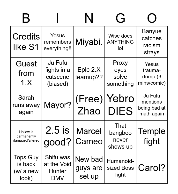This bingo card has a free space and 24 words: 2.5 is good?, Shifu was at the Void Hunter DMV, Epic 2.X teamup??, Tops Guy is back (w/ a new look), Banyue catches racism strays, Credits like S1, Guest from 1.X, Yesus remembers everything!!, Yebro DIES, Marcel Cameo, Proxy eyes solve something, Sarah runs away again, That bangboo never shows up, Temple fight, Ju Fufu fights in a cutscene (biased), Humanoid-sized Boss fight, Ju Fufu mentions being bad at math again, Miyabi., Yesus trauma-dump (3 mins/comic), Mayor?, Carol?, Hollow is permanently damaged/altered, Wise does ANYTHING lol and New bad guys are set up.