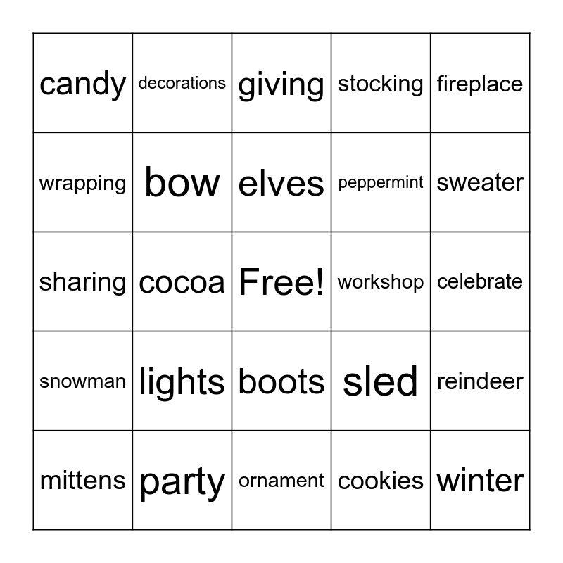This bingo card has a free space and 46 words: snow, winter, holiday, ornament, lights, tree, decorations, presents, wrapping, ribbon, bow, stocking, reindeer, sled, sleigh, Santa, elves, workshop, chimney, fireplace, cocoa, cookies, candy, peppermint, gingerbread, sweater, mittens, scarf, boots, snowman, icicle, frosty, jingle, bells, music, party, celebrate, family, friends, cheer, joyful, giving, sharing, kindness, surprise and festive.