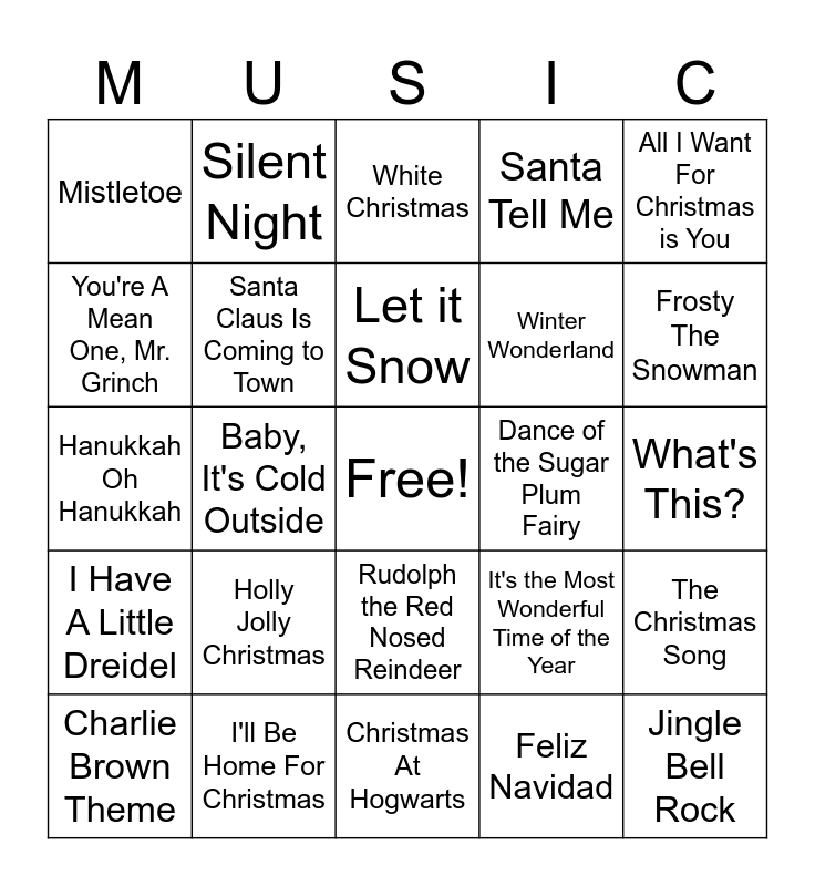 This bingo card has a free space and 24 words: Holly Jolly Christmas, I'll Be Home For Christmas, Let it Snow, Charlie Brown Theme, All I Want For Christmas is You, Mistletoe, You're A Mean One, Mr. Grinch, Silent Night, Dance of the Sugar Plum Fairy, Rudolph the Red Nosed Reindeer, Winter Wonderland, Hanukkah Oh Hanukkah, It's the Most Wonderful Time of the Year, The Christmas Song, Santa Claus Is Coming to Town, Feliz Navidad, What's This?, White Christmas, Frosty The Snowman, Baby, It's Cold Outside, Jingle Bell Rock, I Have A Little Dreidel, Santa Tell Me and Christmas At Hogwarts.