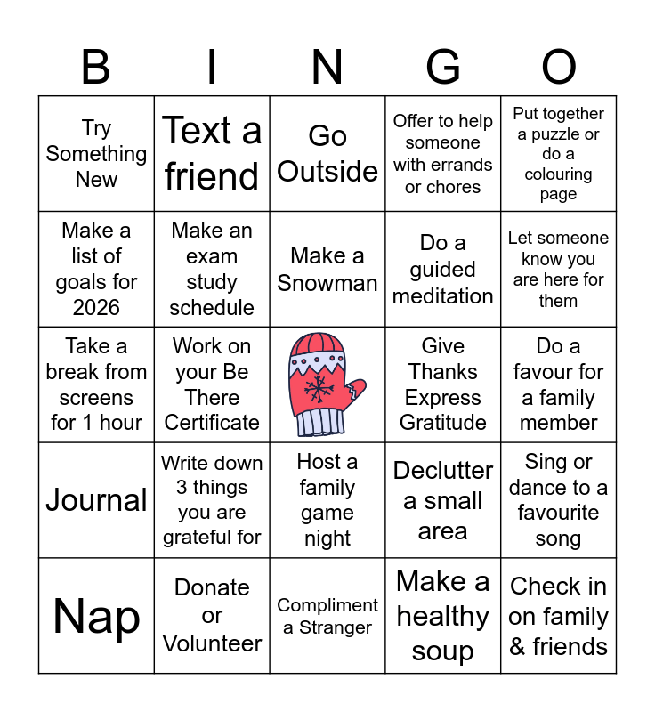 This bingo card has a free space and 24 words: Write down 3 things you are grateful for, Donate or Volunteer, Make a Snowman, Nap, Put together a puzzle or do a colouring page, Try Something New, Make a list of goals for 2026, Text a friend, Give Thanks Express Gratitude, Host a family game night, Do a guided meditation, Take a break from screens for 1 hour, Declutter a small area, Sing or dance to a favourite song, Make an exam study schedule, Make a healthy soup, Do a favour for a family member, Go Outside, Let someone know you are here for them, Work on your Be There Certificate, Check in on family & friends, Journal, Offer to help someone with errands or chores and Compliment a Stranger.