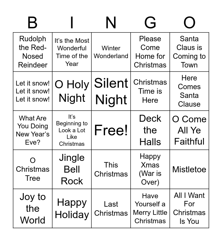This bingo card has a free space and 50 words: Holly Jolly Christmas, All I Want For Christmas Is You, Rockin Around the Christmas Tree, Last Christmas, Jingle Bell Rock, Santa Can’t You Hear Me, It’s the Most Wonderful Time of the Year, Driving Home for Christmas, Let it snow! Let it snow! Let it snow!, Feliz Navidad, O Holy Night, Please Come Home for Christmas, Mistletoe, Happy Xmas (War is Over), Jingle Bells, Santa Claus is Coming to Town, Silent Night, Deck the Halls, Holiday Road, Santa Claus is Coming to Town, It’s Beginning to Look a Lot Like Christmas, Have Yourself a Merry Little Christmas, Rudolph the Red-Nosed Reindeer, Christmas Time is Here, Little Saint Nick, You’re a Mean One, Mr. Grinch, Here Comes Santa Clause, Mele Kalikimaka, Winter Wonderland, This Christmas, God Rest Ye Merry Gentlemen, Frosty the Snowman, Caroling, Caroling, Do You Hear What I Hear?, Happy Holiday, Silver Bells, I’m Gonna Be Warm This Winter, Home for the Holidays, O Tannenbaum, O Come All Ye Faithful, The First Noel, Little Drummer Boy, O Little Town of Bethlehem, Baby, It’s Cold Outside, Joy to the World, What Are You Doing New Year’s Eve?, Silent Night, I Saw Mommy Kissing Santa Claus, O Christmas Tree and Hark! The Herald Angels Sing.