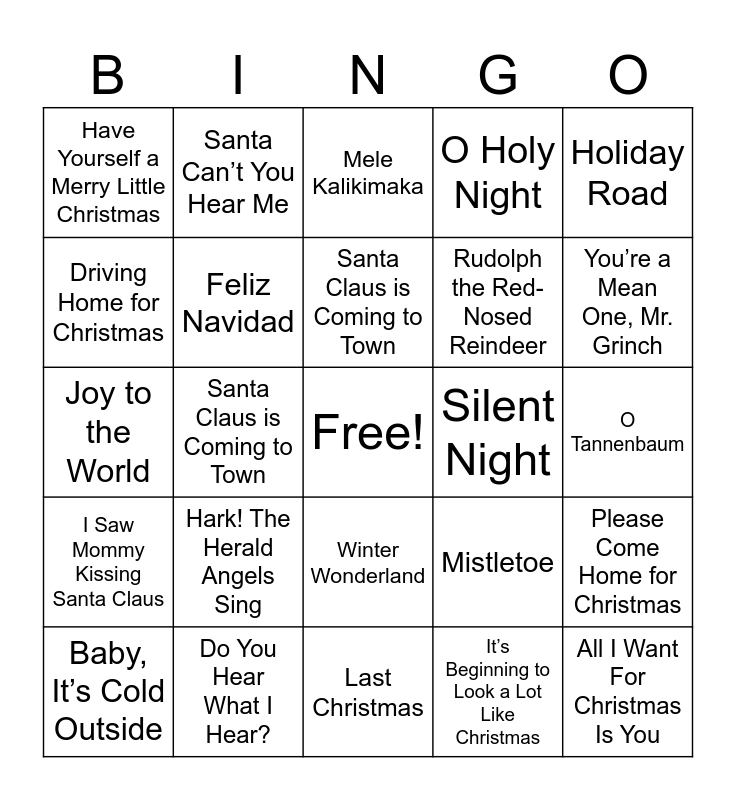 This bingo card has a free space and 50 words: Holly Jolly Christmas, All I Want For Christmas Is You, Rockin Around the Christmas Tree, Last Christmas, Hark! The Herald Angels Sing, Jingle Bell Rock, Santa Can’t You Hear Me, It’s the Most Wonderful Time of the Year, Driving Home for Christmas, Let it snow! Let it snow! Let it snow!, Feliz Navidad, O Holy Night, Please Come Home for Christmas, Mistletoe, Happy Xmas (War is Over), Jingle Bells, Santa Claus is Coming to Town, Silent Night, Deck the Halls, Holiday Road, Santa Claus is Coming to Town, It’s Beginning to Look a Lot Like Christmas, Have Yourself a Merry Little Christmas, Rudolph the Red-Nosed Reindeer, Christmas Time is Here, Little Saint Nick, You’re a Mean One, Mr. Grinch, Here Comes Santa Clause, Mele Kalikimaka, Winter Wonderland, This Christmas, God Rest Ye Merry Gentlemen, Frosty the Snowman, Caroling, Caroling, Do You Hear What I Hear?, Happy Holiday, Silver Bells, I’m Gonna Be Warm This Winter, Home for the Holidays, O Tannenbaum, O Come All Ye Faithful, The First Noel, Little Drummer Boy, O Little Town of Bethlehem, Baby, It’s Cold Outside, Joy to the World, What Are You Doing New Year’s Eve?, Silent Night, I Saw Mommy Kissing Santa Claus and O Christmas Tree.