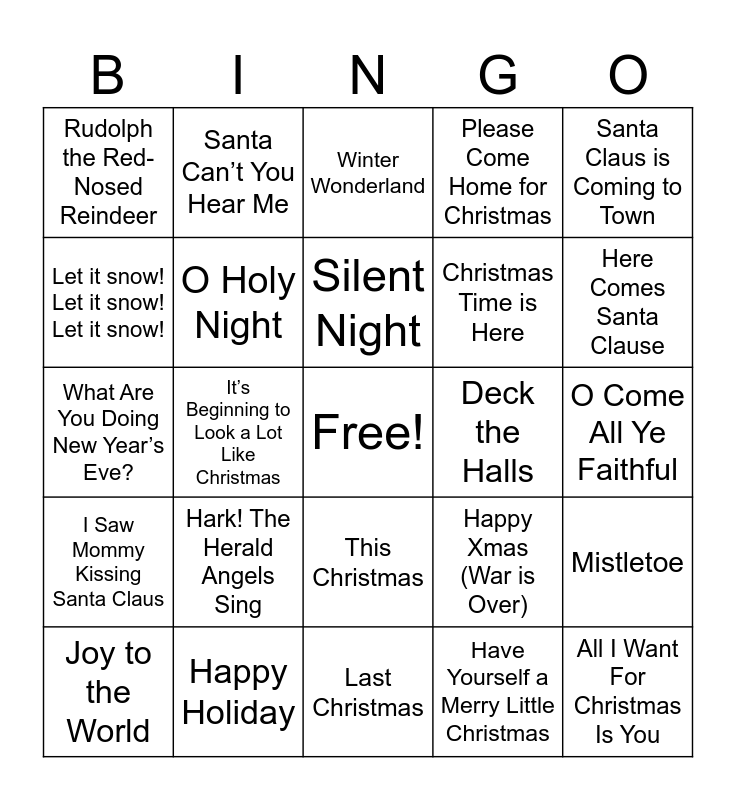 This bingo card has a free space and 50 words: Holly Jolly Christmas, All I Want For Christmas Is You, Rockin Around the Christmas Tree, Last Christmas, Hark! The Herald Angels Sing, Jingle Bell Rock, Santa Can’t You Hear Me, Driving Home for Christmas, Let it snow! Let it snow! Let it snow!, Feliz Navidad, O Holy Night, Please Come Home for Christmas, Mistletoe, Happy Xmas (War is Over), Jingle Bells, Santa Claus is Coming to Town, Silent Night, Deck the Halls, Holiday Road, Santa Claus is Coming to Town, It’s Beginning to Look a Lot Like Christmas, Have Yourself a Merry Little Christmas, Rudolph the Red-Nosed Reindeer, Christmas Time is Here, Little Saint Nick, You’re a Mean One, Mr. Grinch, Here Comes Santa Clause, Mele Kalikimaka, Winter Wonderland, This Christmas, God Rest Ye Merry Gentlemen, Frosty the Snowman, Caroling, Caroling, Do You Hear What I Hear?, Happy Holiday, Silver Bells, I’m Gonna Be Warm This Winter, Home for the Holidays, O Tannenbaum, O Come All Ye Faithful, The First Noel, Little Drummer Boy, O Little Town of Bethlehem, Baby, It’s Cold Outside, Joy to the World, What Are You Doing New Year’s Eve?, Silent Night, It’s the Most Wonderful Time of the Year, I Saw Mommy Kissing Santa Claus and O Christmas Tree.