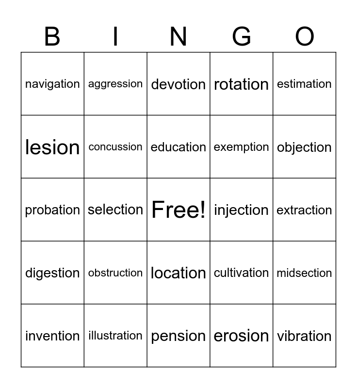 This bingo card has a free space and 39 words: fraction, retraction, permission, concussion, invention, location, education, elevation, estimation, digestion, selection, rotation, vibration, extraction, injection, obstruction, infusion, navigation, frustration, cultivation, lesion, pension, exemption, objection, expression, activation, oppression, extinction, addiction, aggression, motion, regulation, devotion, illustration, erosion, relationship, midsection, probation and eviction.