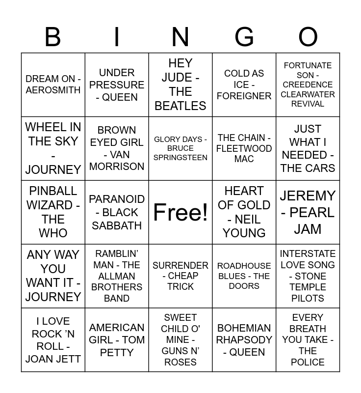 This bingo card has a free space and 58 words: ALL RIGHT NOW - FREE, AMERICAN GIRL - TOM PETTY, ANOTHER BRICK IN THE WALL - PINK FLOYD, ANY WAY YOU WANT IT - JOURNEY, BOHEMIAN RHAPSODY - QUEEN, THE BOYS ARE BACK IN TOWN - THIN LIZZY, BROWN EYED GIRL - VAN MORRISON, CENTERFOLD - THE J GEILS BAND, THE CHAIN - FLEETWOOD MAC, COCAINE - ERIC CLAPTON, COLD AS ICE - FOREIGNER, CRAZY TRAIN - OZZY OSBOURNE, DO IT AGAIN - STEELY DAN, (DON’T FEAR) THE REAPER - BLUE OYSTER CULT, DOWN ON THE CORNER - CREEDENCE CLEARWATER REVIVAL, DREAM ON - AEROSMITH, EVERY BREATH YOU TAKE - THE POLICE, FORTUNATE SON - CREEDENCE CLEARWATER REVIVAL, GIMME SHELTER - THE ROLLING STONES, GLORY DAYS - BRUCE SPRINGSTEEN, HEART OF GOLD - NEIL YOUNG, HEY JUDE - THE BEATLES, I LOVE ROCK ’N ROLL - JOAN JETT, INTERSTATE LOVE SONG - STONE TEMPLE PILOTS, IT’S STILL ROCK AND ROLL TO ME - BILLY JOEL, JEREMY - PEARL JAM, THE JOKER - STEVE MILLER BAND, JUMP - VAN HALEN, JUST WHAT I NEEDED - THE CARS, LA GRANGE - ZZ TOP, LAYLA - DEREK & THE DOMINOS, LIFE IN THE FAST LANE - EAGLES, MAGGIE MAY - ROD STEWART, MAGIC MAN - HEART, MISSISSIPPI QUEEN - MOUNTAIN, MORE THAN A FEELING - BOSTON, NIGHT MOVES 0 BOB SEGER, PARANOID - BLACK SABBATH, PINBALL WIZARD - THE WHO, PURPLE HAZE - JIMI HENDRIX, RAMBLIN’ MAN - THE ALLMAN BROTHERS BAND, REFUGEE - TOM PETTY, ROADHOUSE BLUES - THE DOORS, SMELLS LIKE TEEN SPIRIT - NIRVANA, SMOKE ON THE WATER - DEEP PURPLE, SULTANS OF SWING - DIRE STRAITS, SUNSHINE OF YOUR LOVE - CREAM, SURRENDER - CHEAP TRICK, SWEET CHILD O' MINE - GUNS N’ ROSES, SWEET HOME ALABAMA - LYNYRD SKYNYRD, TAKE IT EASY - EAGLES, TAKIN’ CARE OF BUSINESS - BACHMAN-TURNER OVERDRIVE, THUNDERSTRUCK - AC/DC, TOM SAWYER - RUSH, UNDER PRESSURE - QUEEN, WALK THIS WAY - AEROSMITH, WHEEL IN THE SKY - JOURNEY and WHOLE LOTTA LOVE - LED ZEPPELIN.