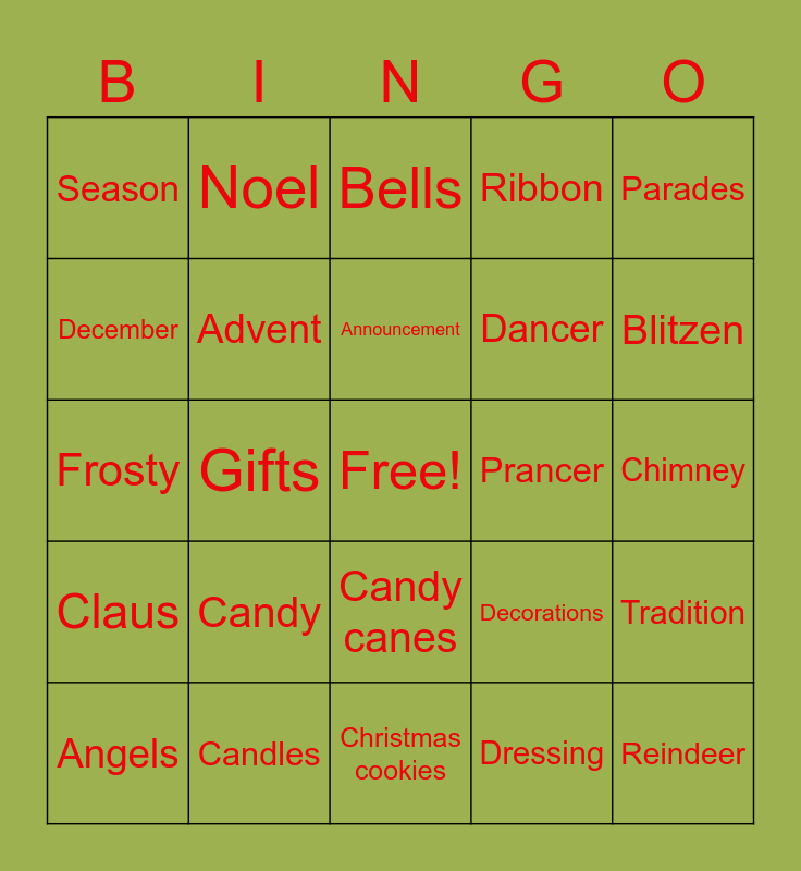 This bingo card has a free space and 33 words: Rudolph, Sauce, Gifts, Star, Claus, Advent, Parades, Angels, Noel, North Pole, Announcement, Bells, Bethlehem, Poinsettia, Prancer, Blitzen, Candles, Frosty, Candy, Decorations, Candy canes, Scrooge, Season, Chimney, Christmas cookies, Reindeer, Ribbon, Dancer, December, Tradition, TrafficDolls, Dressing and Eggnog.