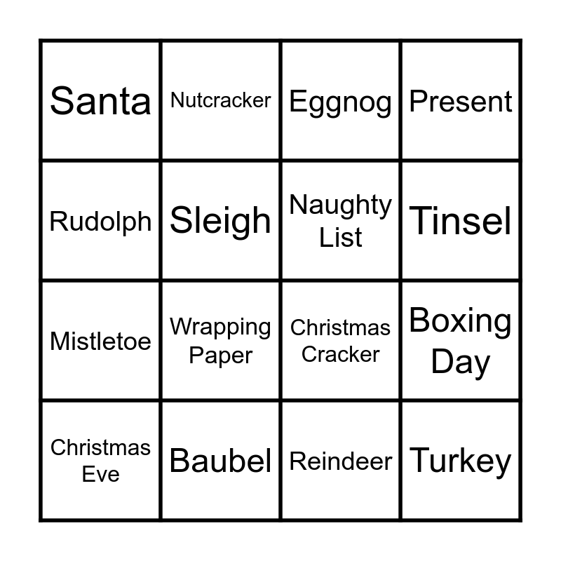 This bingo card has 16 words: Baubel, Boxing Day, Eggnog, Santa, Mistletoe, Nutcracker, Christmas Cracker, Reindeer, Rudolph, Sleigh, Christmas Eve, Present, Wrapping Paper, Tinsel, Naughty List and Turkey.