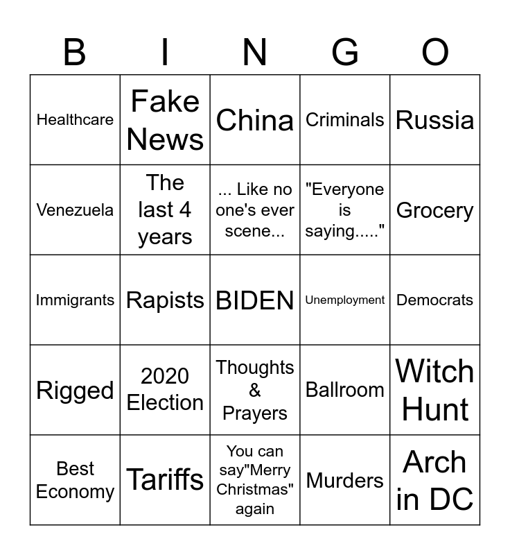 This bingo card has a free space and 24 words: 2020 Election, Tariffs, ... Like no one's ever scene..., Best Economy, Russia, Healthcare, Venezuela, Fake News, Unemployment, Thoughts & Prayers, "Everyone is saying.....", Immigrants, Ballroom, Witch Hunt, The last 4 years, Murders, Democrats, China, Grocery, Rapists, Arch in DC, Rigged, Criminals and You can say"Merry Christmas" again.