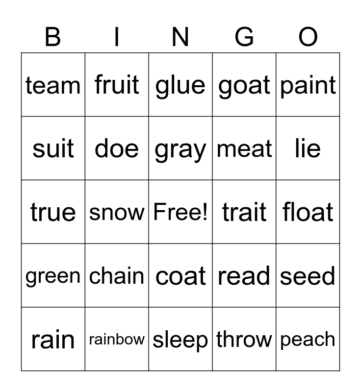 This bingo card has a free space and 24 words: rain, chain, gray, throw, paint, team, fruit, glue, trait, float, true, doe, read, seed, suit, rainbow, sleep, goat, lie, green, snow, coat, meat and peach.