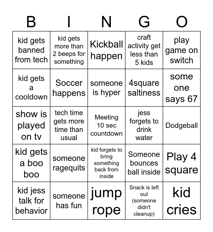 This bingo card has a free space and 24 words: someone ragequits, someone has fun, someone is hyper, kid jess talk for behavior, play game on switch, kid gets banned from tech, kid gets a cooldown, kid gets more than 2 beeps for something, jess forgets to drink water, kid forgets to bring something back from inside, 4square saltiness, show is played on tv, Someone bounces ball inside, Play 4 square, Soccer happens, Snack is left out (someone didn't cleanup), Dodgeball, Kickball happen, some one says 67, tech time gets more time than usual, kid cries, kid gets a boo boo, craft activity get less than 5 kids and jump rope.
