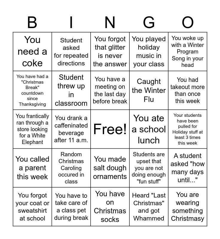 This bingo card has a free space and 24 words: Random Christmas Caroling occured in class, You have to take care of a class pet during break, You have a meeting on the last day before break, You forgot your coat or sweatshirt at school, You woke up with a Winter Program Song in your head, You need a coke, You have had a "Christmas Break" countdown since Thanksgiving, Student asked for repeated directions, You ate a school lunch, You made salt dough ornaments, Caught the Winter Flu, You frantically ran through a store looking for a White Elephant, Students are upset that you are not doing enough "fun stuff", A student asked "how many days until...", Student threw up in classroom, Heard "Last Christmas" and got Whammed, Your students have been pulled for Holiday stuff at least 3 times this week, You forgot that glitter is never the answer, You had takeout more than once this week, You drank a caffeninated beverage after 11 a.m., You are wearing something Christmasy, You called a parent this week, You played holiday music in your class and You have on Christmas socks.
