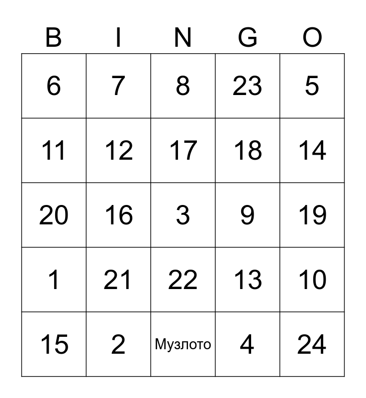 This bingo card has 25 words: 1, 2, 3, 4, 5, 6, 7, 8, 9, 10, 11, 12, Музлото, 13, 14, 15, 16, 17, 18, 19, 20, 21, 22, 23 and 24.