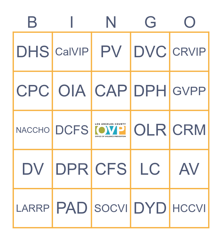 This bingo card has a free space and 67 words: ARDI, ARPA, ATI, AV, BOS, C&G, CalVIP, CART, CAP, CFCI, CFS, CHYA, CRM, CRVIP, CVI, CPC, DCFS, DHS, DMH, DPH, DPR, DV, DVC, DYD, ELA, FAP, FF, GBV, GVPP, GVRO, HCCVI, HVIP, ISD, IPV, JAG, LARRP, LASD, LC, NACCHO, NVDRS, OCPA, OIA, OLR, Our SPOT, OWH, P2P, PO, PAD, PSZ, PIE, PV, RIC, RVPI, SAPC, SC, SOCVI, SOW, SST, TDVAM, TIC, TICWG, TTA, UC, VDRS, WBK, WWA and YSP.