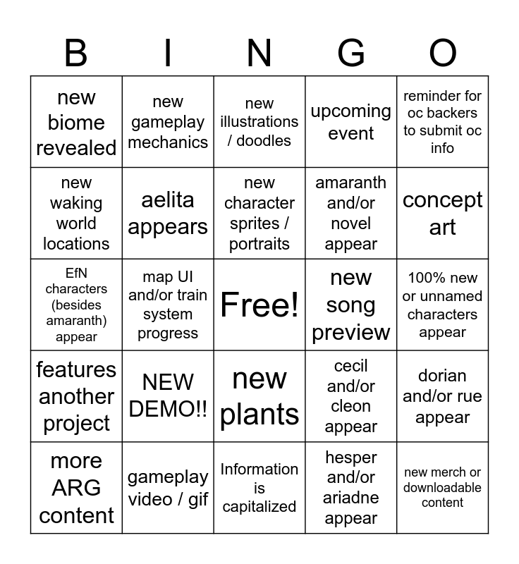 This bingo card has a free space and 24 words: NEW DEMO!!, gameplay video / gif, new character sprites / portraits, more ARG content, reminder for oc backers to submit oc info, new biome revealed, new waking world locations, new gameplay mechanics, new song preview, new plants, amaranth and/or novel appear, EfN characters (besides amaranth) appear, cecil and/or cleon appear, dorian and/or rue appear, aelita appears, hesper and/or ariadne appear, 100% new or unnamed characters appear, new illustrations / doodles, concept art, map UI and/or train system progress, new merch or downloadable content, features another project, upcoming event and Information is capitalized.