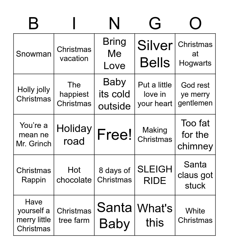 This bingo card has a free space and 53 words: Let it go, White Christmas, Grandma got run over by a reindeer, What's this, Hot chocolate, Jingle bells, Christmas vacation, Hey Santa clause, Holly jolly Christmas, Frosty the snowman, The happiest Christmas, The merriest, Santa claus got stuck, SLEIGH RIDE, Winter wonderland/ sleigh ride, Have yourself a merry little Christmas, Baby its cold outside, Making Christmas, Here it is Christmastime, Christmas at Hogwarts, Holiday road, Little drummer boy, Put a little love in your heart, Snowman, Santa coming for us, Christmas tree farm, Carol of the bells, Surfin santa, I saw mommy kissing Santa, God rest ye merry gentlemen, The chipmunk song, Feliz Navidad, Winter wonderland / don't worry be happy, Like its Christmas, Mistletoe, All I want for Christmas, Silver Bells, Santa Baby, Bring Me Love, Cozy Little Christmas, Never Do a Tango with an eskimo, Pennies from heaven, Too fat for the chimney, Santa jenny 8675309, You for Christmas, 8 days of Christmas, Counting down the days, Take me home for Christmas, You’re a mean ne Mr. Grinch, Christmas Rappin, Kris Kringle Jingle, We wish you the merriest and hotta chocolatta.