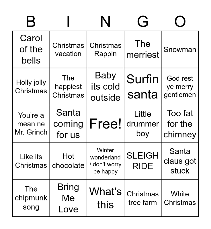 This bingo card has a free space and 49 words: Let it go, White Christmas, Grandma got run over by a reindeer, What's this, Hot chocolate, Jingle bells, Christmas vacation, Hey Santa clause, Holly jolly Christmas, Frosty the snowman, The happiest Christmas, The merriest, Santa claus got stuck, SLEIGH RIDE, Winter wonderland/ sleigh ride, Have yourself a merry little Christmas, Baby its cold outside, Little drummer boy, Put a little love in your heart, Snowman, Santa coming for us, Christmas tree farm, Carol of the bells, Surfin santa, I saw mommy kissing Santa, God rest ye merry gentlemen, The chipmunk song, Feliz Navidad, Winter wonderland / don't worry be happy, Like its Christmas, Mistletoe, All I want for Christmas, Silver Bells, Santa Baby, Bring Me Love, Cozy Little Christmas, Never Do a Tango with an eskimo, Pennies from heaven, Too fat for the chimney, Santa jenny 8675309, You for Christmas, 8 days of Christmas, Counting down the days, Take me home for Christmas, You’re a mean ne Mr. Grinch, Christmas Rappin, Kris Kringle Jingle, We wish you the merriest and hotta chocolatta.