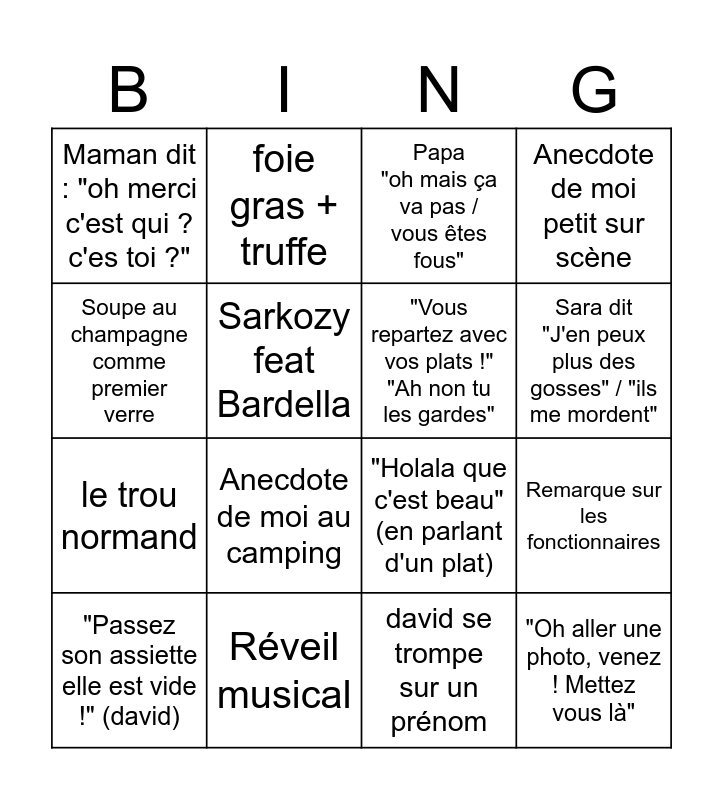 This bingo card has 16 words: Réveil musical, Remarque sur les fonctionnaires, Papa "oh mais ça va pas / vous êtes fous", Maman dit : "oh merci c'est qui ? c'es toi ?", le trou normand, foie gras + truffe, "Holala que c'est beau" (en parlant d'un plat), david se trompe sur un prénom, Soupe au champagne comme premier verre, Sarkozy feat Bardella, "Passez son assiette elle est vide !" (david), Anecdote de moi petit sur scène, Anecdote de moi au camping, Sara dit "J'en peux plus des gosses" / "ils me mordent", "Vous repartez avec vos plats !" "Ah non tu les gardes" and "Oh aller une photo, venez ! Mettez vous là".