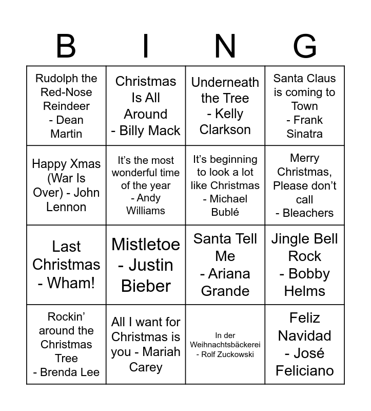 This bingo card has 16 words: All I want for Christmas is you - Mariah Carey, Jingle Bell Rock - Bobby Helms, Underneath the Tree - Kelly Clarkson, Rudolph the Red-Nose Reindeer - Dean Martin, Last Christmas - Wham!, Christmas Is All Around - Billy Mack, Santa Tell Me - Ariana Grande, In der Weihnachtsbäckerei - Rolf Zuckowski, Happy Xmas (War Is Over) - John Lennon, It’s the most wonderful time of the year - Andy Williams, Rockin’ around the Christmas Tree - Brenda Lee, Santa Claus is coming to Town - Frank Sinatra, Mistletoe - Justin Bieber, Merry Christmas, Please don’t call - Bleachers, It’s beginning to look a lot like Christmas - Michael Bublé and Feliz Navidad - José Feliciano.