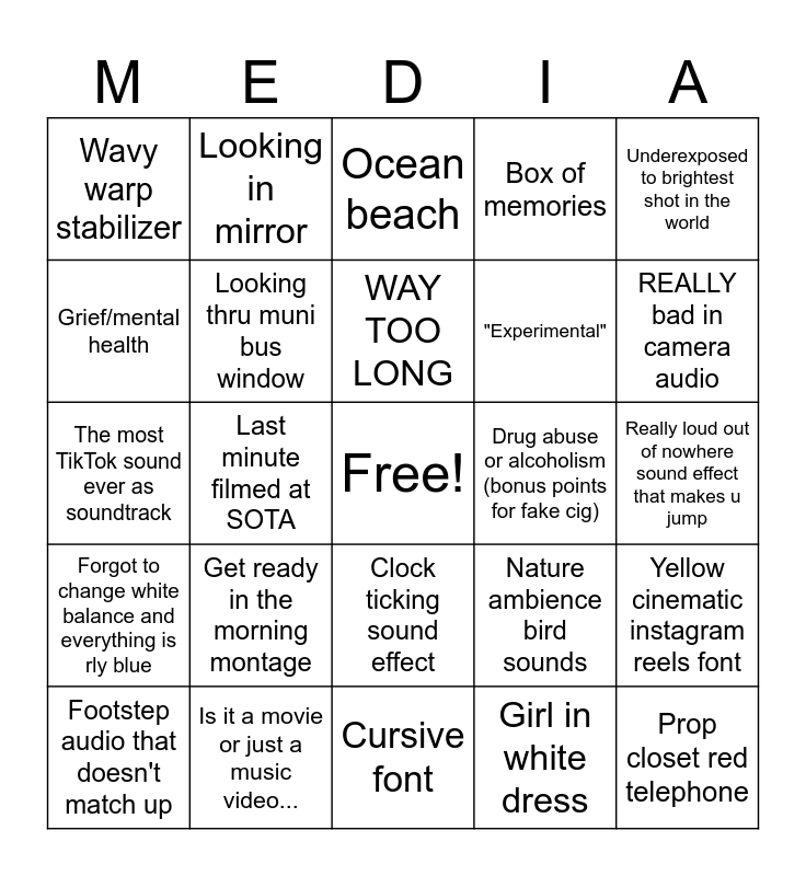 This bingo card has a free space and 26 words: Footstep audio that doesn't match up, Get ready in the morning montage, Clock ticking sound effect, Girl in white dress, REALLY bad in camera audio, Wavy warp stabilizer, Looking in mirror, Ocean beach, "Experimental", Yellow cinematic instagram reels font, Grief/mental health, Last minute filmed at SOTA, Nature ambience bird sounds, Prop closet red telephone, The most TikTok sound ever as soundtrack, Is it a movie or just a music video..., WAY TOO LONG, Drug abuse or alcoholism (bonus points for fake cig), Underexposed to brightest shot in the world, Forgot to change white balance and everything is rly blue, Looking thru muni bus window, Overly dramatic music, Box of memories, Really loud out of nowhere sound effect that makes u jump, Cursive font and Colorgrading is just yellow filter.