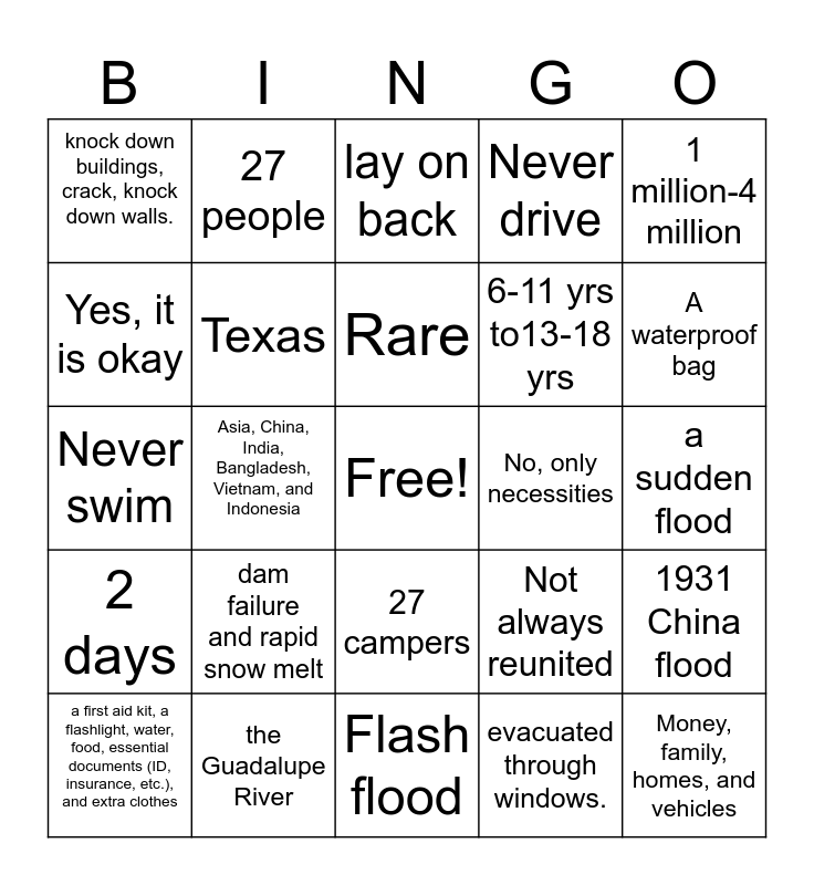 This bingo card has a free space and 25 words: dam failure and rapid snow melt, Flash flood, Rare, a first aid kit, a flashlight, water, food, essential documents (ID, insurance, etc.), and extra clothes, 1 million-4 million, knock down buildings, crack, knock down walls., Yes, it is okay, 27 people, No, only necessities, 27 campers, 6-11 yrs to13-18 yrs, Never swim, Not always reunited, 1931 China flood, Texas, July 4th, 2024, a sudden flood, lay on back, A waterproof bag, Asia, China, India, Bangladesh, Vietnam, and Indonesia, Money, family, homes, and vehicles, the Guadalupe River, 2 days, Never drive and evacuated through windows..