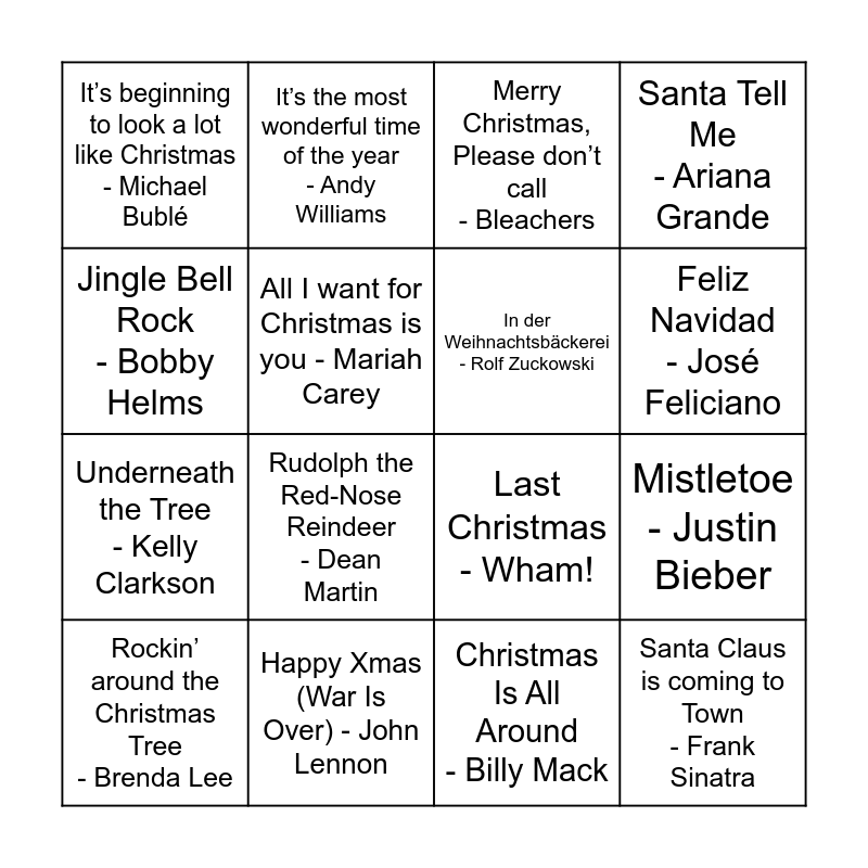This bingo card has 16 words: Happy Xmas (War Is Over) - John Lennon, Mistletoe - Justin Bieber, Merry Christmas, Please don’t call - Bleachers, It’s beginning to look a lot like Christmas - Michael Bublé, Underneath the Tree - Kelly Clarkson, It’s the most wonderful time of the year - Andy Williams, Last Christmas - Wham!, Christmas Is All Around - Billy Mack, Jingle Bell Rock - Bobby Helms, All I want for Christmas is you - Mariah Carey, Rockin’ around the Christmas Tree - Brenda Lee, Santa Tell Me - Ariana Grande, Rudolph the Red-Nose Reindeer - Dean Martin, Feliz Navidad - José Feliciano, In der Weihnachtsbäckerei - Rolf Zuckowski and Santa Claus is coming to Town - Frank Sinatra.
