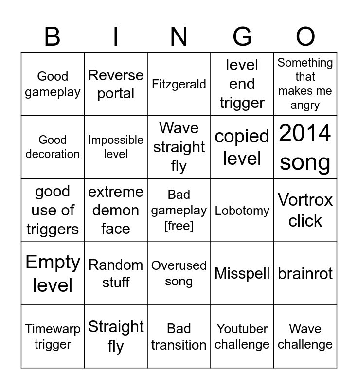 This bingo card has a free space and 24 words: Random stuff, Straight fly, Wave straight fly, Timewarp trigger, Something that makes me angry, Good gameplay, Good decoration, Reverse portal, Lobotomy, Overused song, copied level, good use of triggers, Misspell, brainrot, Impossible level, Youtuber challenge, Vortrox click, Fitzgerald, 2014 song, extreme demon face, Wave challenge, Empty level, level end trigger and Bad transition.