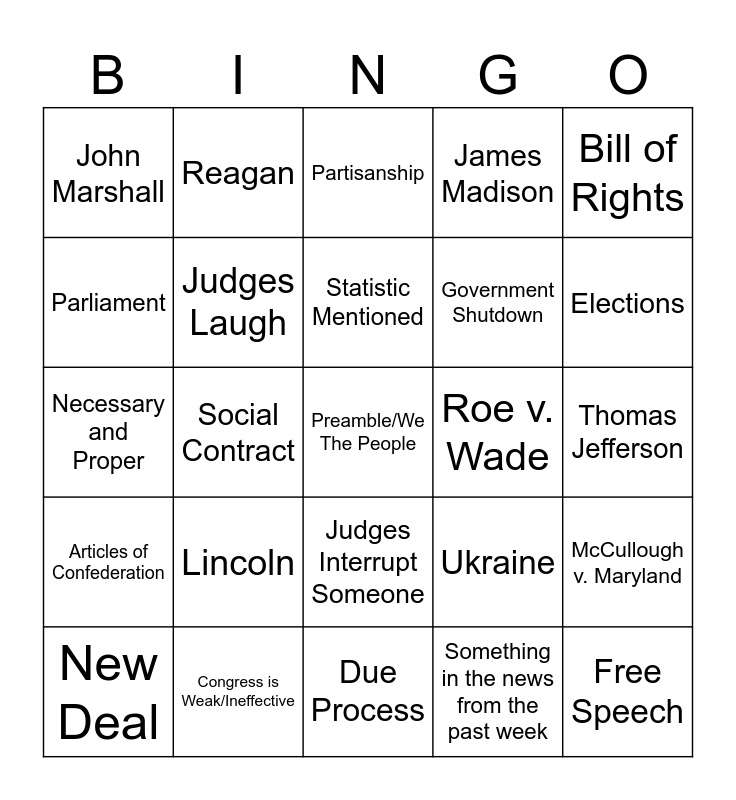 This bingo card has 40 words: FDR, Necessary and Proper, Fed 10, Judges Laugh, Congress is Weak/Ineffective, Judges Interrupt Someone, Statistic Mentioned, Article III, Bill of Rights, Articles of Confederation, Social Contract, James Madison, Preamble/We The People, Thomas Jefferson, Roe v. Wade, Lincoln, Executive Order, John Marshall, Brown v. Board, Partisanship, McCullough v. Maryland, Something in the news from the past week, Government Shutdown, Parliament, Greece/Rome, Fed 51, Article I, Impeachment, Free Speech, Civil War, American Revolution, New Deal, Watergate, Ukraine, Elections, Due Process, Andrew Jackson, Religion, Reagan and Trump.