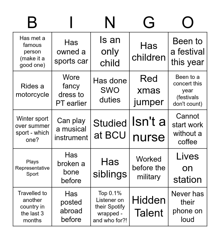 This bingo card has a free space and 29 words: Travelled to another country in the last 3 months, Can speak multiple languages, Can play a musical instrument, Has ran a marathon, Has met a famous person (make it a good one), Is an only child, Wore fancy dress to PT earlier, Has broken a bone before, Isn't a nurse, Has posted abroad before, Cannot start work without a coffee, Never has their phone on loud, Top 0.1% Listener on their Spotify wrapped - and who for?!, Hidden Talent, Been to a concert this year (festivals don't count), Can whistle loudly - the one with fingers in the mouth, Has siblings, Plays Representative Sport, Been to a festival this year, Winter sport over summer sport - which one?, Worked before the military, Has a van - including campers, Red xmas jumper, Rides a motorcycle, Has children, Has owned a sports car, Lives on station, Has done SWO duties and Benson/Oxford is your first posting.