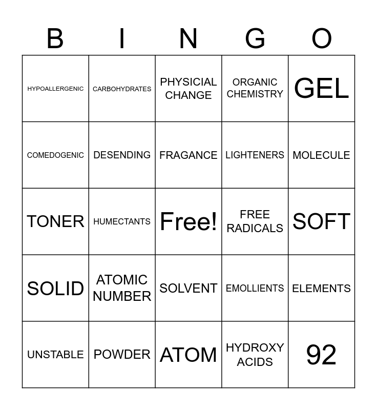 This bingo card has a free space and 52 words: 4.5 to 5.5, 92, ACID MANTLE, ATOM, ATOMIC NUMBER, BIOCHEMISTRY, CARBOHYDRATES, CHEMISTRY, COMEDOGENIC, COMPOUND, DESENDING, ELECTRON, ELEMENTS, EMOLLIENTS, EMULSION, FDA, FRAGANCE, FREE RADICALS, FTC, GEL, HUMECTANTS, HYDROXY ACIDS, HYPOALLERGENIC, LIGHTENERS, LIPOPHILIC, LIQUID, MATTER, MIXTURE, MOLECULE, NEUTRON, OINTMENTS, ORGANIC CHEMISTRY, PERFORMANCE INGREDIENTS, PH, PH ADJUSTORS, PHYSICIAL CHANGE, POWDER, PRESERVATIVE, PROTON, SACHARIDE, SATURATION POINT, SOFT, SOLID, SOLUTE, SOLVENT, SUNSCREEN, SURFACTANTS, TONER, UVA, WATER, UNSTABLE and PERIODIC LAW.