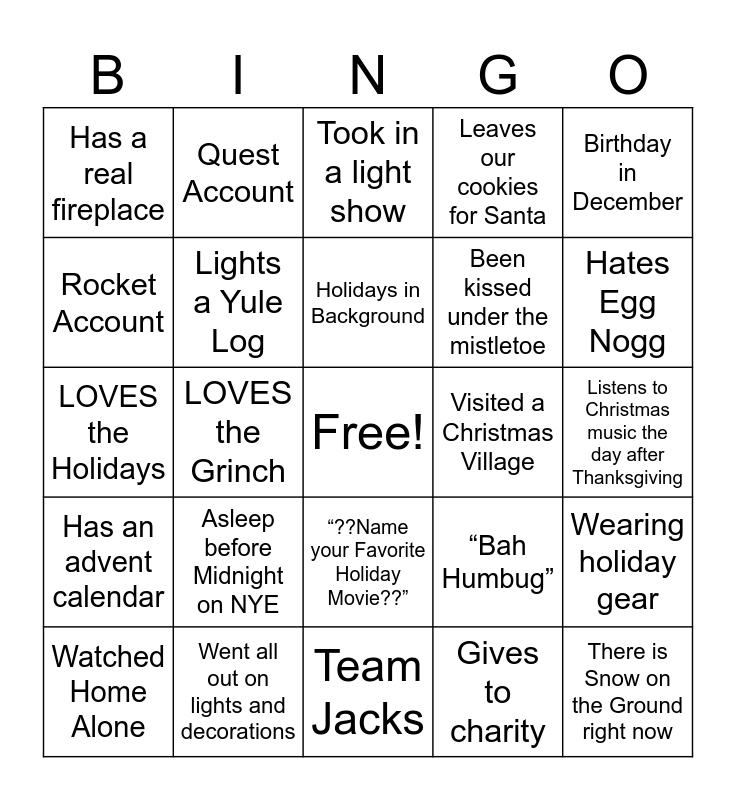 This bingo card has a free space and 58 words: Travel out of state for holidays, Went all out on lights and decorations, Hang ornaments from childhood, Has an advent calendar, Gives to charity, Sent out Christmas Cards, Lights a Yule Log, Bakes Cookies, Been kissed under the mistletoe, Took picture with Santa, Leaves our cookies for Santa, Drive around to see lights, Has blow up decorations, Has a real tree, Changed social media pic to holiday theme, Has a real fireplace, There is Snow on the Ground right now, Birthday in December, Happy Holidays in Email Signature, Holidays in Background, Visited a Christmas Village, Took in a light show, Watched Home Alone, Wearing holiday gear, Loves the Holidays a little TOO MUCH, Listens to Christmas music the day after Thanksgiving, Hosting Christmas, LOVES Egg Nogg, Hates Egg Nogg, Never had Egg Nogg, Will Watch New Stranger Things over Christmas break, Has Seen The Movie Jingle All the Way, Die Hard IS a Christmas Movie, Die Hard is NOT a Christmas Movie, Last Minute Shopper, Finished Holiday Shopping, Has NOT Started Holiday Shopping, LOVES the Grinch, LOVES the Holidays, Stays up to see Midnight for NYE, Asleep before Midnight on NYE, “Happy Holidays!”, “Bah Humbug”, Has Attended an Ugly Sweater Party, Has watched Elf this holiday season, Has Elf On the Shelf, “Most Holiday Cheer!”, “??Name your Favorite Holiday Movie??”, Team Jacks, Team Schaeffer, Team Bacon, GEV account, Western Union Account, Prime Account, Quest Account, PWC Account, Rocket Account and Sherwin Williams Account.