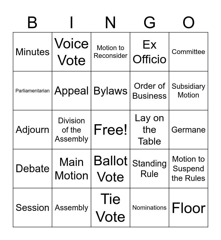 This bingo card has a free space and 40 words: Abstain, Adjourn, Amend, Appeal, Assembly, Ballot Vote, Bylaws, Chair, Committee, Debate, Division of the Assembly, Ex Officio, Floor, Germane, Lay on the Table, Main Motion, Majority Vote, Minutes, Motion, Motion to Reconsider, Motion to Suspend the Rules, Nominations, Order of Business, Parliamentarian, Point of Order, Postpone Indefinitely, Previous Question, Quorum, Recess, Rescind, Second, Session, Special Order, Standing Rule, Subsidiary Motion, Tie Vote, Two-Thirds Vote, Unanimous Consent, Voice Vote and Yield the Floor.