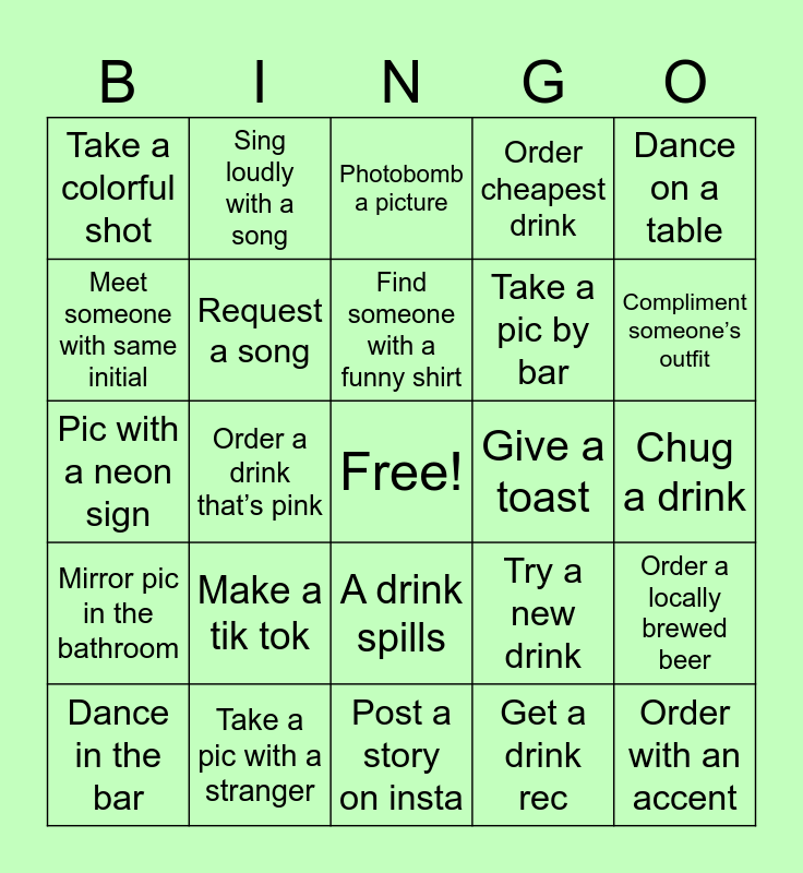 This bingo card has a free space and 26 words: A drink spills, Get a drink rec, Find someone with a funny shirt, Take a pic with a stranger, Dance on a table, Take a colorful shot, Meet someone with same initial, Sing loudly with a song, Chug a drink, Try a new drink, Take a pic by bar, Pic with a neon sign, Order a locally brewed beer, Dance in the bar, Order a drink that’s pink, Have an arm wrestling match, Order cheapest drink, Mirror pic in the bathroom, Photobomb a picture, Order with an accent, Compliment someone’s outfit, Post a story on insta, Give a toast, Make a tik tok, Request a song and Swap drinks with a friend.
